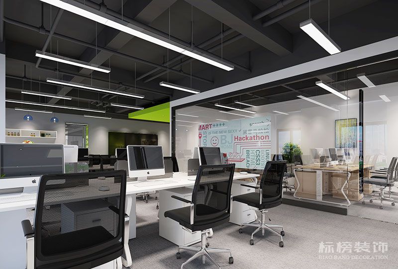 此办公室主要以白色为主,灰色与绿色来点缀空间,多采用玻璃隔墙来区分区域,后期玻璃上将贴关于公司文化磨砂纸,既能有个人的私密性,又能展示公司的文化。办公室照明以吊线灯为主,简单美观又能足够的明亮。
